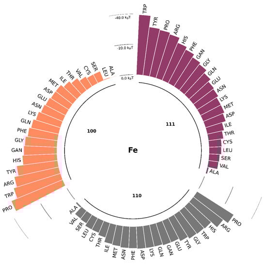 The protein adsorption energies predicted by the UA model (Table 2) are high and correspond to the irreversible binding of these molecules. This is a result of a high activity of zero-valent Fe. For example, for the BSA protein, the average adsorption energy for all fcc facets was for zero-valent Ag [] and for zero-valent Au [,] vs. for zero-valent Fe. Please refer to Figures S3–S8 for the comparison of heatmaps depicting the interaction of each milk protein on Fe-100, Fe-110 and Fe-111 surfaces.