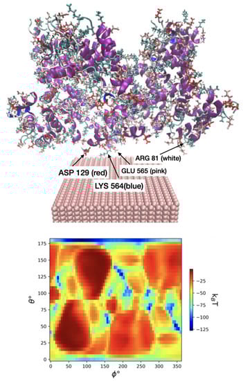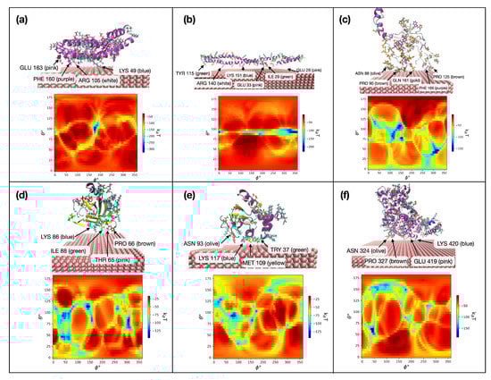 The preferred orientations of all 820 milk proteins based on the lowest energy from heatmaps are reported in the Table S2 of the Supplementary Material. We performed calculations with 5 Fe NPs of radii 5 nm, 20 nm, 50 nm, 80 nm, and 100 nm to study the size dependence of adsorption energies. The data are presented in the Supplementary Materials (Figure S2). Figure 5 shows the output of the UA model for the six selected milk proteins on iron NPs. The heatmap contains the adsorption energies for all values of and . The blue spots (with lower energy) correspond to the more favorable orientations of immobilized proteins. A 3D presentation of the protein on the NP surface is shown on top of each heatmap corresponding to the same protein. The closest AAs to the surface of the NP are marked in each case. Analysis of the configurations shows that LYS, GLU, PRO, and ASN are the most likely to be in contact with the metal surface. This observation is in agreement with the results from ref. [] that are discussed in Section 3.3.