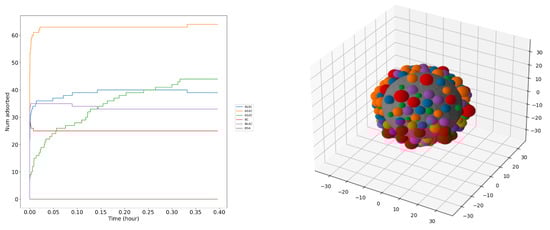 Protein adsorption kinetics on an FeNP plot that shows the adsorption–desorption of each protein over time (left). A snapshot of an NP (gray) of radius size 20 nm with protein corona of milk proteins (colored) adsorbing on the surface using the KMC model (right).