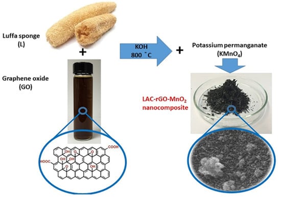 A supercapacitor is a great supplement for energy conversion and high-rate power supply devices that deliver significant energy with high power density [1,2]. Recently, more interests have been focused on designing novel electronic devices by developing high-performance supercapacitors [3,4,5,6]. Due to their unique features, including high power density, fast charge and discharge rate, and long cycle life, supercapacitors are a promising substitute for current energy-storing devices [7,8]. Generally, Supercapacitors are divided into two categories: pseudocapacitors and electric double-layer capacitors (EDLCs) based on the charge storage mechanism [9]. A variety of materials have been chosen as possible electrodes in supercapacitors, including (1) carbonaceous structures (activated carbon, carbon nanotubes, carbon nanofiber, graphene) [10,11], (2) conductive polymers (polypyrrole, polyaniline) [12,13] and (3) transition metal oxides (RuO2, MnO2, V2O5, Fe2O3, SnO2) [14]. The combination mechanisms (faradaic and non-faradaic) as hybrid supercapacitors (HSCs) have been prepared by using composite electrodes or cell configuration (asymmetric) to achieve higher performances [15,16]. The agricultural precursors are low price, environmentally friendly, more available, and porosity-intrinsic [17], include clover stems [18], lotus leaves [19], pueraria [20], rice husk [21], bamboo [22], coconut shell [23], dead leaves [24], hemp [25], cattail [26], sugarcane bagasse [27], sunflower seed shells [28], corn husk [29] and luffa sponge [15,30,31,32,33,34] which have been successfully converted into ACs. These materials could be further processed by chemical, physical, and a combination of carbonization and activation processes to reach a desired surface topography and morphology [26,35]. For example, hydrothermal carbonization in the presence of KOH has been considered an efficient technique to convert precursors into a superior three-dimensional (3D) morphology and improve the surface area and functional groups [36]. To date, several studies have attempted to modify luffa and obtain micrometer-scale channels [30,32], three-dimensional and hierarchical porous [31,34], carbon quantum dots (CQDs) [33], carbon/metal oxide porous [15] and activated carbon structures. Different composite materials made from carbonaceous structures containing MnO2 pseudocapacitors have been studied and presented as novel active materials in HSC electrodes due to their high capacitance, higher energy density and long cycle life [37,38]. The narrow size distribution of micropores in graphene provides a high surface area that would favor the EDLC performance, while activated carbon, derived from organic wastes, can create a 3D interconnected structure [30,31,32]. Scientific literature and studies on the development of metal oxide-carbon material electrodes utilizing high capacitance of metal oxide (pseudocapacitance) and activated carbon (EDLC) along with high electrical conductivity of graphene [37,38,39]. In the present work, a novel ternary composite structure has been designed based on luffa-activated carbon-reduced graphene oxide-metal oxide (LAC-rGO-MnO2) to fabricate high-performance asymmetric supercapacitors. The LAC works as a good 3D substrate for ion transport and capacitor devices based on a uniquely dense and intrinsic multi-channeled arrangement structure [40]. The LAC-rGO is expected to be a great substrate for accommodating MnO2 nanoparticles based on unique physiochemical properties. The hierarchical 3D structure of LAC, in-situ chemical reduction and metal oxide decoration were obtained by a facile procedure involving the simultaneous hydrothermal carbonization and chemical activation of bio-based precursor and GO reduction. The main objectives of this work were to (i) simultaneously transform luffa sponge into AC along with the in-situ hydrothermal reduction of GO sheets followed by further MnO2 decoration, (ii) to discuss the electrochemical properties of the different composite electrodes, and (iii) to assemble a high-performance asymmetric supercapacitor made of ternary composite electrodes.
