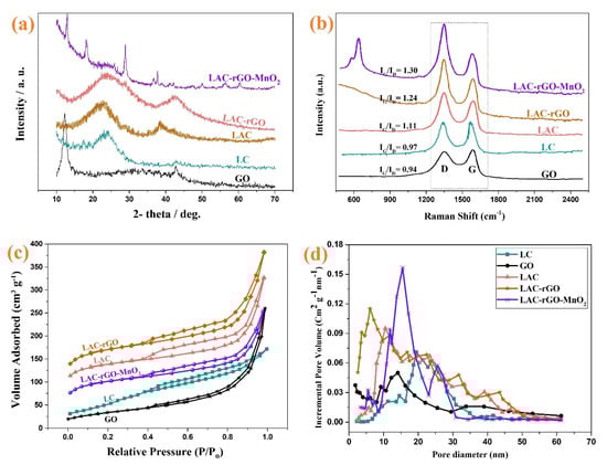 XRD spectra of GO, LC, LAC, LAC-rGO and LAC-rGO-MnO2 nanocomposites (a), Raman spectra of GO, LC, LAC, LAC-rGO, LAC-rGO-MnO2 nanocomposites (b), N2 adsorption and desorption isotherms (c), and BJH pore size distribution of GO, LC, LAC, LAC-rGO, and LAC-rGO-MnO2 nanocomposites (d).