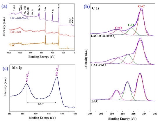 XPS spectra of LAC, LAC-rGO and LAC-rGO-MnO2 (a), high-resolution of C1s of LAC, LAC-rGO and LAC-rGO-MnO2 (b) and high-resolution of Mn 2p of LAC-rGO-MnO2 (c).