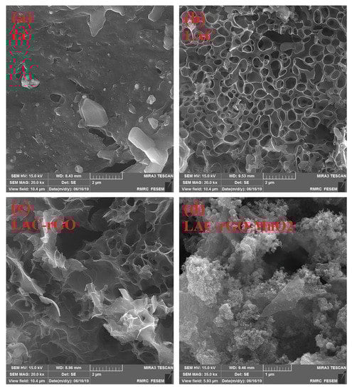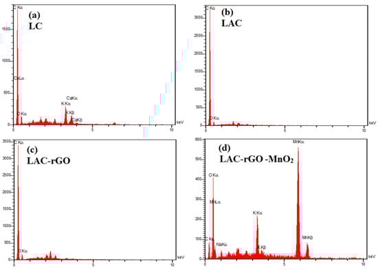 The surface morphology of the LA and LAC structures in the presence of rGO and MnO2 nanostructures have been investigated by FESEM (Figure 5). Figure 5a,b illustrates that the activated sample (LAC) has higher porous morphology and open sites in comparison to LC. The in-situ reduction of GO, along with carbonization and activation (Figure 5c), tends to produce a hierarchical high surface area structure which is confirmed by BET results (Table 1). The loading of MnO2 nanoparticles on the LAC-rGO surface is clear in Figure 5d as nanocomposite decorations to obtain multifunctional activity in electrochemical performance. The EDS analysis of all the samples is shown in Figure 6.