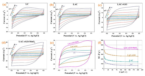 The CV of LC, LAC, LAC-rGO and LAC-rGO-MnO2 electrodes at different sweep rates (a–d), the CV curves of LC, LAC, LAC-rGO and LAC-rGO-MnO2 electrodes at 50 mV s−1 (e), the SC vs scan rates for LC, LAC, LAC-rGO and LAC-rGO-MnO2 electrodes (f).