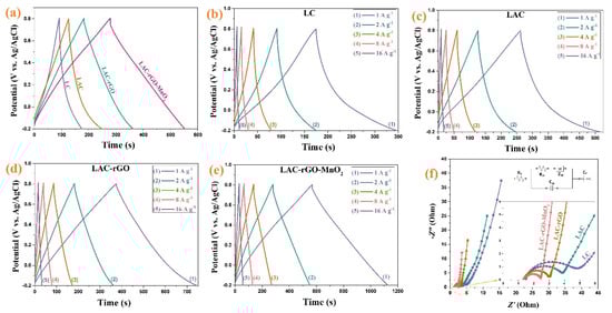 The GCD curves of the LC, LAC, LAC-rGO and LAC-rGO-MnO2 electrodes at constant current density of 2 A g−1 (a), The GCD curves of the LC, LAC, LAC-rGO and LAC-rGO-MnO2 electrodes at various current densities (1, 2, 4, 8, 16 A g−1) (b–e), and Nyquist plots of LC, LAC, LAC-rGO and LAC-rGO-MnO2 electrodes (f).
