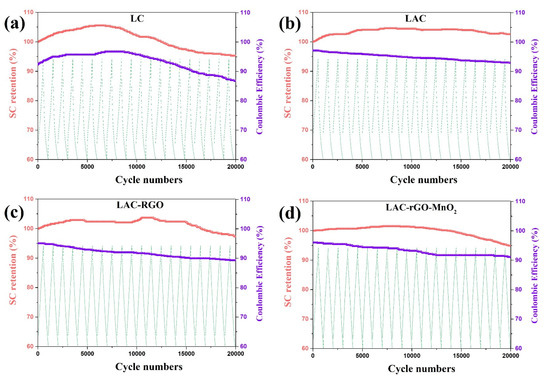 The cycling life of over 20,000 continuous charge/discharge for all electrodes was tested at a current density of 16 A g−1. Figure 9 illustrates the retention of SC as a function of the charge/discharge cycles for all sample electrodes. The composite electrodes exhibit excellent electrochemical stability without any declination of the initial SC over 20,000 cycles. The increase of capacitance retention occurs based on better wetting and swelling of the micro-scale channels electrode with activation of new sites in the electrodes, which increases the charge transferability [41]. Increasing the number of electroactive sites in electrodes with the extended charge–discharge cycles is principally responsible for the rapid reactions, and hence the cycling stability increases. Moreover, the electrodes exhibit a superior coulombic efficiency after 20,000 cycles [48]. Table 3 shows the comparison of supercapacitive behavior between LAC-rGO-MnO2 and reported luffa-derived activated carbon composites.