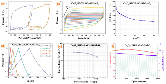 Based on the electrochemical measurement, the LAC-rGO-MnO2 was selected as the best composite electrode material in this research to assemble an asymmetric hybrid supercapacitor. The Co3O4/rGO composite electrode with a well-known characterized structure and electrochemical properties—which was published in previous research [41]—has been used as a negative electrode. The overall electrochemical measurement of assembled Co3O4/rGO//LAC-rGO-MnO2 HSC is shown in Figure 10. It was founded that the positive and negative electrodes possess a potential window from −0.2 to 0.8 V and −1 to 0 V, respectively (Figure 10a). Thus, for the obtained asymmetric supercapacitor, the final cell voltage which can be used is the sum of the potential window of two electrodes. Figure 10b shows the optimized CV curves of Co3O4/rGO//LAC-rGO-MnO2 HSC at various scan rates (5 to 200 mV s−1) with a potential window of 1.8 V. The fabricated asymmetric supercapacitor shows an ideal capacitive behavior with a nearly rectangular shape in CV curves with a potential window of 1.8 V. The SC variation trends as a function of scan rate are shown in Figure 10c. As shown, at the higher scan rates, the SC decreases because the time constraint limits the diffusion and movement of ions [1]. At the scan rate of 2 mV s−1, the maximum amounts of SC for Co3O4/rGO//LAC-rGO-MnO2 HSC were obtained 286 F g−1. The decrease of a maximum of 52.8% in the SC, even at scan rates as high as 200 mV s−1, is an indication of the outstanding capacitive retaining tendency of the HSC device.