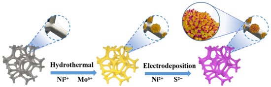 NiS is another material currently being considered for electrochemical hydrogen production []. NF was selected as the substrate for the study due to its high porosity and electrical conductivity; however, its bare framework structure may result in an uneven dispersion of active species [,]. To enhance rapid electron transport, the incorporation of NiMoO4/NiMo onto the NF not only elevates the specific surface area but also preserves the structure.