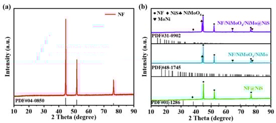 XRD patterns for (a) NF and (b) NF@NiS, NF/NiMoO4/NiMo, and NF/NiMoO4/NiMo@NiS samples.