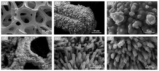 SEM images of (a) NF; (b,c) NF@NiS; (d,e) NF/NiMoO4/NiMo; and (f) NF/NiMoO4/NiMo@NiS.
