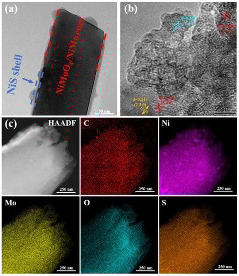 TEM was used to further explore the structural properties of the as-prepared NF/NiMoO4/NiMo@NiS composite. The TEM image in Figure 4a demonstrated a rod−like structure of the NiMoO4/NiMo composite, with a diameter of approximately 100–200 nm, which is consistent with the SEM results. The HRTEM image in Figure 4b revealed lattice stripe spacings of 0.252 nm, corresponding to the (−2 4 1) crystal planes of NiMoO4, and 0.214 nm, confirming the presence of (2 2 0) NiS crystallographic planes in the composite. Furthermore, lattice stripe spacings of 0.408 nm and 0.351 nm, matching the (2 5 5) and (5 4 0) crystal planes of NiMo, respectively, were also observed in the same image.