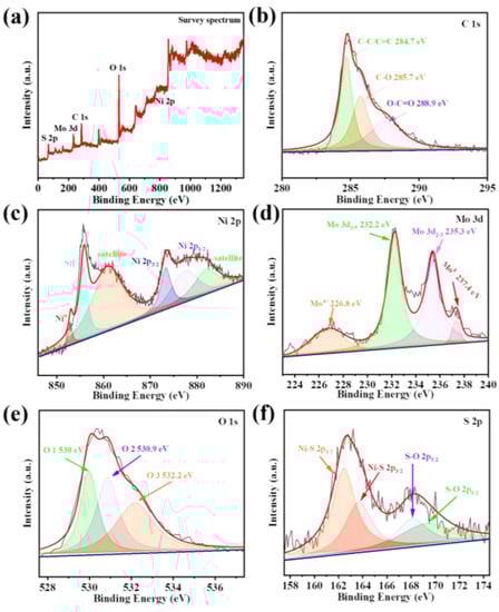 (a) For the NF/NiMoO4/NiMo@NiS material, the XPS survey spectrum. Spectra of: (b) C 1s, (c) Ni 2p, (d) Mo 3d, (e) O 1s, and (f) S 2p, in the NF/NiMoO4/NiMo@NiS material.