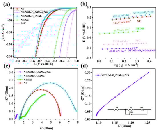 (a) Polarization LSV curves for the HER at a scan rate of 5 mV·s−1. (b) Tafel plots of NF, NF@NiS, NF/NiMoO4/NiMo, and NF/NiMoO4/NiMo@NiS. (c) EIS of NF, NF@NiS, NF/NiMoO4/NiMo, and NF/NiMoO4/NiMo@NiS in the frequency range between 100 kHz and 10 MHz. (d) NF/NiMoO4/NiMo@NiS in the frequency range between 100 kHz and 10 MHz. Be aware that 1.0 M KOH solution is used for all electrochemical measurements of the HER performance for the catalysts.
