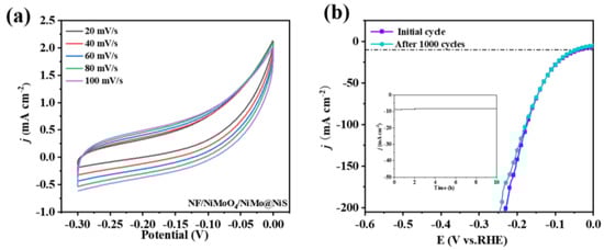 CVs of (a) NF/NiMoO4/NiMo@NiS measured at different scan rates. (b) Initial overpotential and overpotential after 1000 cycles and the 10 h chronopotentiometric curve obtained for NF/NiMoO4/NiMo@NiS at a constant current density of 10 mA·cm−2.