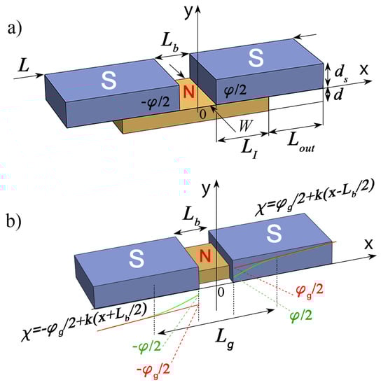 We consider a normal (N) metal film connecting two massive superconducting (S) electrodes of length located at a distance from the center of the film (see Figure 1a). Here, is the length of overlap between the S and N layers, while is the length of the free outer part of the S electrode. We place the origin of coordinates on the upper surface of the N film in the middle of the SN-N-NS structure and direct the x and y axes along and perpendicular to the SN interfaces, respectively. The existence of the proximity effect between the N and S materials should lead to the induction of superconducting correlations into the N metal, leading to Josephson coupling between the S banks.