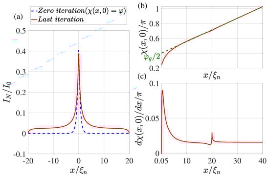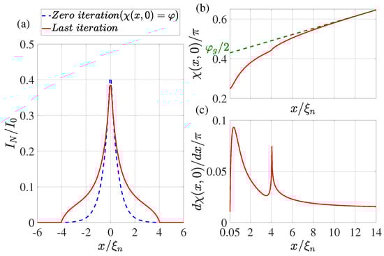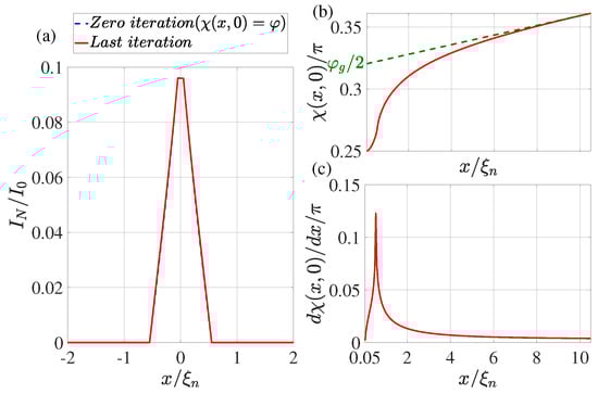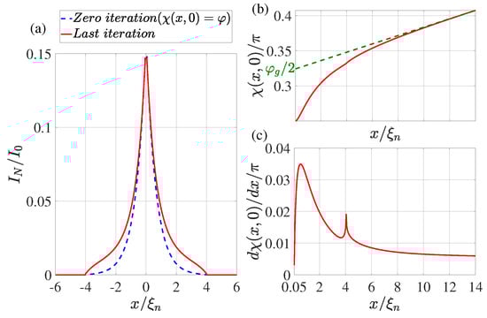 (a) The coordinate dependence of the current flowing through the N film. The dotted blue line shows the result obtained at the zeroth iteration (), while the solid red line shows the dependence obtained at the last iteration. (b) Distribution of phase of the superconducting order parameter at the last iteration. The dotted green line shows the linear extrapolation of the function from the region . (c) The derivative of the phase of the order parameter as a function of coordinate x at the last iteration. Calculations have been performed for , , , , , , , , .