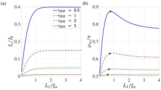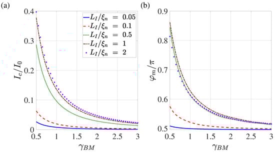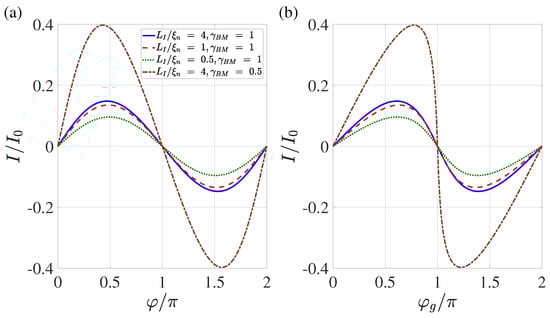 Such an equivalent scheme of Josephson contact actually implies taking into account part of the inductance of the S electrodes in the form of changing the shape of contact current–phase relation. With this description, the part of the S electrodes () in which there is a noticeable deviation of the dependence of from the linear one formally turns out to belong to the weak coupling region. The calculation results presented in Figure 2b, Figure 3b, Figure 4b and Figure 5b allow us to conclude that and weakly depend on and .