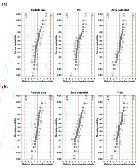 One of the most common batch synthesis methods for the preparation of AuNPs is the Turkevich method, which chemically reduces metal salts in aqueous media using suitable, mild reducing agents such as Na3Cit [,] or AA [,]. In this process, the molar ratio of the reducing agent and metal salt is a crucial parameter that determines the particle size and PdI. Other parameters that need to be considered are pH, temperature, reaction time and the presence of other ions and molecules [,,,]. To optimize the procedure, a DoE study was performed to adjust the aforementioned parameters for both reduction agents. The obtained data, using Na3Cit as a reduction agent for particle size, were in the range of 5.95 ± 2.26 nm and 45.91 ± 3.14 and showed PdI values between 0.07 ± 0.01 and 0.75 ± 0.29. The zeta potential values ranged from –35.53 ± 0.58 mV to 0.90 ± 0.16 mV for the prepared batches. The use of AA as a reduction agent resulted in a larger dh with mean sizes ranging from 44.71 ± 2.99 nm to 212.33 ± 2.45 nm. DLS measurements proposed rather polydisperse samples with at least two fractions, i.e., one from 40 to 70 nm and the second between 150 and 180 nm. This may indicate agglomeration rather than the formation of larger particles. To carefully identify the most appropriate synthesis conditions yielding de-agglomerated and thus more stable batches, the focus was laid on the fraction of the smallest sizes around 40 and 70 nm by including the respective yield. The yield for the small fraction ranged from 4.5 ± 0.0% to 77.63 ± 19.43%. At specific process conditions, the small fraction disappeared and was replaced by larger agglomerate assemblies with 100% yield. The experimental data were further used for statistical data analysis. The residuals’ normal probability plots were created (Figure 1a (Na3Cit) and Figure 1b (AA)) to evaluate whether the process setup and measurement strategy were reliable and to identify potential outliners (i.e., experiments outside or close to the boundaries (dashed lines)).
