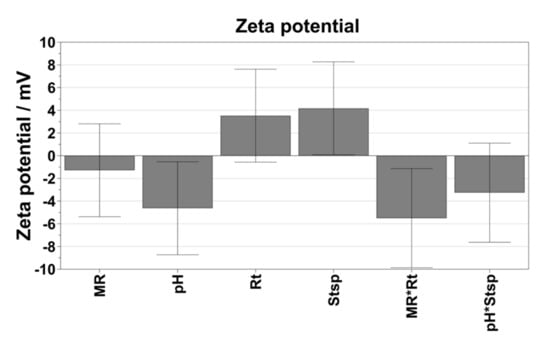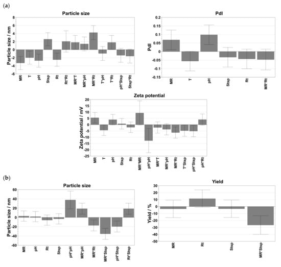 For Na3Cit, the results of all performed experiments were found to be normally distributed regardless of the considered response (i.e., size, PdI, zeta potential), as all data are on a straight line. By contrast, the use of AA as a reduction agent revealed some potential outliners. Considering the size of the response, experiments N5 and N26 were excluded as they were outside the boundaries. For the zeta potential and the PdI, the results of run N5 and N25 were excluded from further statistical data evaluation, as they were also outside the boundaries. Coefficients plots were created to assess the significance of the coefficients and are shown in Figure 2a (i.e., citrate-capped AuNPs) and Figure 2b (i.e., AA-capped). After excluding insignificant parameters (i.e., a small distance from y = 0 and error bars crossing y = 0) to simplify the model and to maximize the performance of prediction, all individually tested input parameters (i.e., molar ratio, pH, reaction time, stirring speed and temperature) showed a significant influence on the resulting particle sizes when using Na3Cit (Figure 2a). In addition, the combinations of molar ratio and reaction time and reaction time and temperature also affected the sizes significantly. The PdI was mainly influenced by the molar ratio, temperature and pH. The zeta potential was affected by the molar ratio, the pH, the reaction temperature and the quadratic effects of the pH and the molar ratio. In addition, the interaction in terms of the molar ratio and reaction time, and to a lower extent, the temperature and stirring speed, as well as the pH and stirring speed, strongly influenced the resulting zeta potential. During the synthesis of AuNPs via AA, size was controlled by the quadratic effects of pH and with the combination of molar ratio and pH, molar ratio and reaction time, molar ratio and stirring speed and reaction time and stirring speed. The zeta potential was significantly influenced by the pH of the reaction media, the stirring speed and the combination of molar ratio and reaction time. Considering the yield of the smallest particle fraction in the batches, it was observed that the combinatory effect of molar ratio and stirring speed had the highest impact.