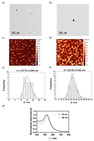 AuNPs characterization: (a,b) TEM micrographs, (c,d) AFM micrographs, (e,f) histograms of the AuNP size distributions obtained from AFM images and (g) optical properties of AuNPs of different sizes conducted with UV-Vis spectrophotometry. (a,c,d) 18 nm AuNPs; (b,d,f) 56 nm AuNPs.