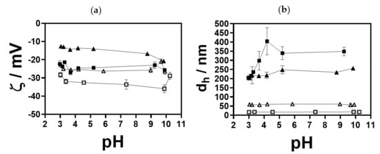 pH-dependent (a) zeta potential and (b) size profiles of AuNPs of different sizes in HCl/NaCl aqueous solution. pH titrations were conducted with the titrant NaOH (0.1 M) at two Ic, i.e., 10 and 50 mM (adjusted with HCl and NaCl); (□) 18 AuNPs at Ic = 10 mM, (■) 18 nm AuNPs at Ic = 50 mM, (△) 56 nm AuNPs at Ic = 10 mM and (▲) 56 nm AuNPs at Ic = 50 mM.