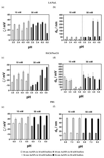As expected, at higher Ic, i.e., 50 mM, the zeta potential values were lower. The isoelectric point was not noticed, and the zeta potential remained negative over the entire pH range. pH-dependent zeta potential profiles for 56 nm sized AuNPs exhibited similar behaviour, with lower zeta potential values compared to 18 nm sized AuNPs. At 10 mM, the sizes of small and medium AuNPs were similar to the AuNPs dispersed in MQ water and remained constant in the pH range tested. The increase in Ic led to an irreversible agglomeration of 18 nm and 56 nm sized AuNPs, independent of the pH. The changes in the zeta potential and size of the small- and medium-sized AuNPs in the LA/NaL-, H3Cit/Na3Cit buffers and PBS at 10 and 50 mM are presented in Figure 5a–f. In 10 mM LA/NaL buffer (Figure 5a,b), small-sized AuNPs retained their initial sizes regardless of the pH; however, as the Ic increased to 50 mM, the size of AuNPs increased from 48 to 290 nm with a rising pH. At 10 mM, the zeta potential was ≈−20 mV for all pH values. In 10 and 50 mM H3Cit/Na3Cit buffer (Figure 5c,d), at lower pH values, the zeta potential of the small NPs changed, indicating that they exhibited less stability. Small-sized AuNPs in PBS (Figure 5e,f) were stable in terms of zeta potential and size at both investigated Ic. The medium-sized AuNPs in LA/NaL buffer (Figure 5a,b) at pH 2.8 showed a slightly lower zeta potential at both Ic. Still, the size was in the range of 50–60 nm, thus confirming a high particle stability. Incubation of the particles in 10 mM H3Cit/Na3Cit buffers (Figure 5c,d) exhibited the same behaviour as in the case of the 18 nm sized AuNPs. With increasing Ic, agglomeration occurred.