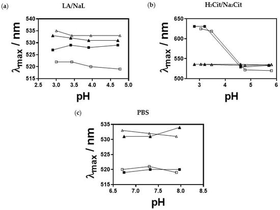 Maximum wavelength (λmax) of the SPR peak of 18 nm and 56 nm AuNPs as a function of pH obtained from UV-Vis spectra in (a) LA/NaL buffer (pH = 2.9–4.8), (b) H3Cit/Na3Cit buffer (pH = 2.8–5.8) and (c) PBS (pH = 6.8–8) at two Ic, 10 mM and 50 mM. (□) 18 AuNPs at Ic = 10 mM, (■) 18 nm AuNPs at Ic = 50 mM, (△) 56 nm AuNPs at Ic = 10 mM and (▲) 56 nm AuNPs at Ic = 50 mM.