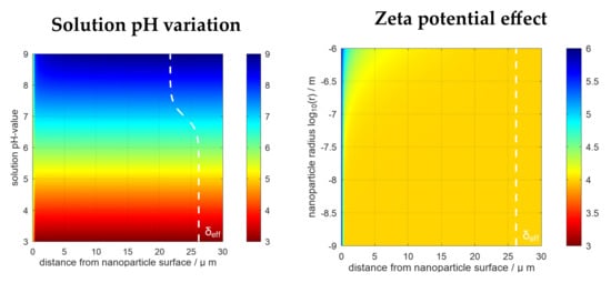 The pH-value distribution near the NPs was derived from the set of spherical diffusion equations for each mobile species in the solution (Equation (1)). Due to the fast kinetics of ionic reactions in solution, all species can be assumed to be in local thermodynamic equilibrium []. This allows one to link the equations and express the concentration of the involved species with a pH gradient. Details of the mathematical derivation are reported elsewhere []. For simplicity, it is assumed that the particles are spherical.