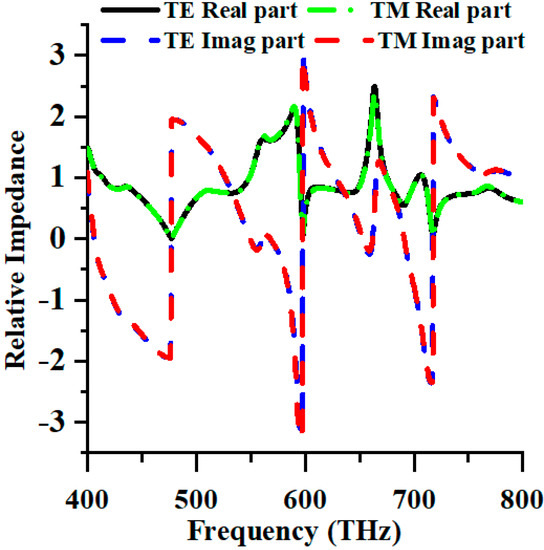 Moreover, Figure 2 depicts the relative impedance of transverse electric (TE) and transverse magnetic (TM) modes. When the real part of the impedance closely approximates unity, and the imaginary component approaches null values, the effective impedance of the structure is in accordance with the impedance of free space, facilitating high absorption levels.