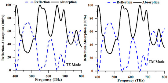 Numerical reflection and absorption spectrum of the proposed structure in TE and TM modes.