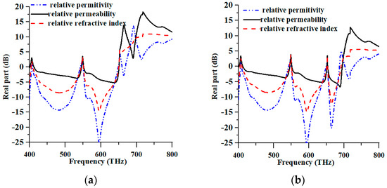 The metamaterial properties of the suggested PMA for TE and TM modes are displayed in Figure 4a and 4b, respectively. Figure 4a–c in the TE mode displayed negative permittivity, permeability, and refractive index at 400–405.60 THz, 408.40–542.80 THz, 550.80–648.40 THz, and 660–668.80 THz; 400–400.80 THz, 413.20–546 THz, and 552.40–550.80 THz; 400–404.80 THz; 410–544.80 THz; and 551.20–650.40 THz. Whereas, in the TM mode, the permittivity, permeability, and refractive index were negative at 400–405.60 THz, 409.20–649.2.80 THz, 654–687.20 THz, and 703.20–728 THz; 400–401.20 THz, 412.80–651.60 THz, and 654.40–695.20 THz; and 400–404.80 THz; 410.4–544.80 THz, 551.20–650.80 THz, and 654–691.60 THz, respectively. Consequently, these negative values indicated that the proposed MMA exhibited high-level wide-band absorption properties in the TM mode. On the other hand, the TE mode also achieved negative values for the metamaterial property.