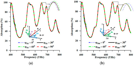 Compliance with the design framework on varying polarisations of EM radiation from the solar source assumes a significant role in the research on PMA architecture for photovoltaic implementation. Designing a solar cell that effectively captures solar energy has proven challenging, as it requires an apparatus capable of containing EM radiation of an arbitrary polarisation. Figure 5 illustrates the absorption rate for different polarisation angles (φ), including the TE and TM modes. The aforementioned absorption rate was examined through numerical analyses at distinct angles ranging from 0° to 90° with a 30° interval. Based on the numerical analysis, the highest absorption peaks were yielded at 99.993%, 99.984%, 99.987%, and 99.989% for polarisation angles of 0°, 30°, 60°, and 90° at 652.40 THz in the TE mode. According to Table 2, the highest peaks of absorption, reaching values of 99.997%, 99.922%, 99.941%, and 99.921%, were also observed in the TM mode at a frequency of 653.2 THz for four distinct polarisation angles, namely 0°, 30°, 60°, and 90°. As depicted in Figure 5a,b, the proposed design configuration exhibited a propensity for nearly constant and optimal absorption in response to all polarisation angles of the incoming EM wave. The absorption response of the proposed structure is depicted in Figure 5a,b, revealing that the suggested structure’s angular disposition led to different treatments of the two modes of EM waves, namely TE and TM. Therefore, the proposed PMA exhibited favourable potential for elucidating the operational mechanism of dynamic absorber devices that operate within distinct spectral ranges of solar irradiance. Furthermore, the material’s insensitivity to TE and TM waves rendered it a promising candidate for the photovoltaic collection of solar energy applications.