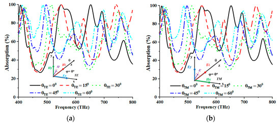 Figure 6a,b depict the alterations in the angle of incidence, ranging from 0° to 60°, for TE and TM modes. As the incidence angles increased, a discernible decrease in the average absorption was observed, accompanied by a shift towards higher frequencies. The correlation between higher incidence angles and longer path lengths reduced the coupling impact. The EM dipolar resonance of the structure experienced a decline due to the decrease in the coupling effect, which subsequently diminished the wave-confining proficiency of the dielectric layer. The determination of absorption was performed using specular reflection. This approach is justified by the simulation outcomes, which revealed a deviation of 15° from the normal incidence, reducing the reflected field strength, coupled with a shift towards higher frequencies. This phenomenon strongly suggested that most reflected energy was concentrated in this direction. Based on the numerical analysis, the TE mode yielded the highest peaks of absorption at 99.979%, 99.992%, 99.922%, 99.534%, and 99.539%, correspondingly, for incident angles of 0°, 15°, 30°, 45°, and 60°, at frequencies of 549.20 THz, 548.80 THz, 514.40 THz, 498.00 THz, and 485.20 THz, respectively. Meanwhile, for the TM mode, the maximum peaks of absorption of 99.987%, 99.994%, 99.857%, 99.928%, and 99.489% were recorded at corresponding frequencies of 549.20 THz, 549.20 THz, 514.40 THz, 496.40 THz, and 485.20 THz, across five distinct incident angles (0°, 15°, 30°, 45°, and 60°). Table 3 tabulates the readings from the TE and TM modes.