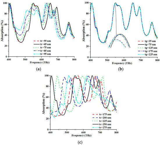 The relationship between the absorption and geometric parameters of the proposed PMA was investigated in depth in this study. The thicknesses of the top (tr) and bottom (tg) metals were altered to assess the response of the PMA. The parameter tr was varied between 55 and 95 nm in increments of 10 nm, as illustrated in Figure 7a. At 653.20 THz and 549.20 THz, the maximum absorption values were estimated at 99.997% and 99.987%, respectively. The highest absorption was achieved at an optimal tr value of 65 nm due to the perfect impedance matching between the free space, the metamaterial unit cell, and the occurrence of resonance conditions.