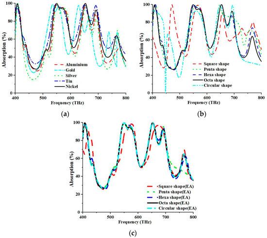 The absorption values are subject to change, owing to the materials employed in the resonator. The conducting materials, such as aluminium, gold, silver, tin, and nickel, were also considered for the analysis of the absorptive properties of the design structure (Figure 8a). The maximum absorption peaks were 99.312%, 98.784%, 97.589%, 98.152%, and 99.987%; 98.573%, 97.294%, 95.148%, 97.139%, and 99.997% for the first and second resonance at 549.20 THz and 653.2 THz, respectively, for different metal resonators (aluminium, gold, silver, tin, and nickel). The absorption was measured to be 99.997% and 99.987% at 653.2 THz and 549.20 THz concurrently for the Ni metal resonator. The proposed design structure with a Ni resonator yielded maximum absorption. The resonant frequency was shifted due to the sweep of the resonator material. Therefore, altering the resonator material can change the materials’ properties. Consequently, the capacitive and inductive effects and varying peak absorptions are also changed. Different resonator shapes such as square, pentagon, hexagon, octagon, and circle, with separate effective areas but the same resonator radius, were created and investigated separately to determine the highest absorption peak. Figure 8b describes the compared and examined impacts with the suggested structure. The most extreme absorption peaks were 83.982%, 96.175%, 99.227%, 99.987%, and 90.198%; 89.159%, 91.706%, 99.925%, 99.997%, and 96.188% for the first and second resonance at 549.20 THz and 653.20 THz, respectively, for different shapes (square, pentagon, hexagon, octagon, and circular). As for the octagonal metal resonator, the absorption was recorded to be 99.997% and 99.987% at 653.2 THz and 549.20 THz, respectively. In short, an octagonal shape is more suitable for solar energy harvesting for high absorption peaks.