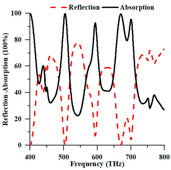 As depicted in Figure 11, the suggested structure exhibited a frequency range within the visible spectrum. Figure 11 is the numeric absorption spectrum of the proposed PMA, as determined using the finite element method. The data collected from Figure 11 indicate that the two maximal absorption peaks at 99.940% and 99.523% are positioned at 504.40 THz and 670 THz, respectively. The variances in the numerical methodology, software model, and substrate material properties resulted in absorption peaks of comparable magnitude with slight alterations in the resonance frequencies.