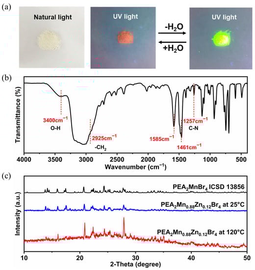 (a) The photographs of PEA2Mn0.88Zn0.12Br4 under natural light and UV light of 365 nm. (b) FTIR spectrum of PEA2Mn0.88Zn0.12Br4. (c) XRD patterns of PEA2Mn0.88Zn0.12Br4 at 25 °C and 120 °C.