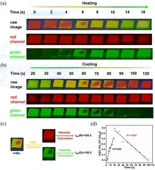 The photographs of PEA2Mn0.88Zn0.12Br4 film under UV light during the heating process (a) and cooling process (b), the corresponding red channel and green channel extracted from the photographs are shown in the middle and bottom. (c) The general calculation procedure of the R value (It(R)) and G (It(G)) value from photographs. (d) The calculation of the change rate of patterns during the heating process and cooling process by linear fittings.
