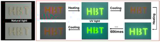 The heating-cooling cycle stability was further tested. As shown in Figure S7, the emission peak, intensity, and FWHM are well maintained after 60 heating-cooling cycles, which is much better than the PEA2MnBr4 single crystal [40]. To further verify the practicability of the PEA2Mn0.88Zn0.12Br4 film, a series of images were captured at different time intervals. Here, the green channel and red channel of the images were extracted via Image J software to study the change of color (Figure 5). The color index (It) can be calculated by the intensity of the red channel (It(R)) and green channel (It(G)) (It = It(G)/It(R) + It(G)). Also, a time-dependence curve could be drawn according to the following equation y = −ln[(1 − It)/(1 − It0)] = kt. Correspondingly, the change rates of the heating process and cooling process can be obtained, which are 0.025 min−1 and −0.006 min−1, respectively. For the anti-countering application, the letters “H”, “B”, and “T” were successfully coated on the paper, which exhibited reversible changes in green and pink emissions during the heating and cooling process. As shown in Figure 6, the “H”, “B”, and “T” still exhibit a bright green color at high temperature after 60 cycles, demonstrating excellent stability in the anti-counterfeiting application.