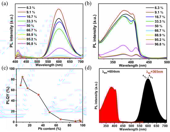 PLE spectra were carried out to investigate the PL mechanism. As shown in Figure 7d, the energy levels of 4T1(P) and 4E(D) maintain at 6% substitution while energy levels of low energy excited states (4A1, 4E(D), 4T2(G), 4T1(G)) disappear. As the Pb2+ concentration changes to 9.1%, the discrete energy levels of 4T1(P) and 4E(D) merge together and another peak located at 414 nm appears. According to previous studies [36,44], this newly appeared peak is assigned to the lead-halide units, indicating that the electronic structure of Pb2+-doped PEA2Mn0.88Zn0.12Br4 is related to the interaction between [MnBr6]4− units and [PbBr6]4− units. Further increasing the Pb2+ doping concentration, the intensity of the PLE peak decreases.