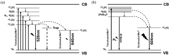 - Meng, Q.; Zhou, L.; Pang, Q.; He, X.; Wei, T.; Zhang, J.Z. Enhanced Photoluminescence of All-Inorganic Manganese Halide Perovskite-Analogue Nanocrystals by Lead Ion Incorporation. J. Phys. Chem. Lett. 2021, 12, 10204–10211. [Google Scholar] [CrossRef]