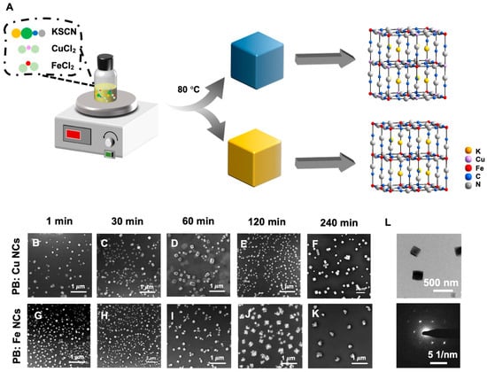 (A) Schematic illustration the synthesis process of PB: Cu and PB: CuFe NCs and SEM images of PB: Cu and PB: CuFe NCs synthesized with 0.15 mM CuCl2 and 0.15 mM FeCl2 during the different reaction times. (1 min: (B,G); 30 min: (C,H); 60 min: (D,I); 120 min: (E,J); 240 min: (F,K)). (L) TEM image and selected area electron diffraction (SAED) patterns of PB: CuFe NCs during the reaction time at 1 min.