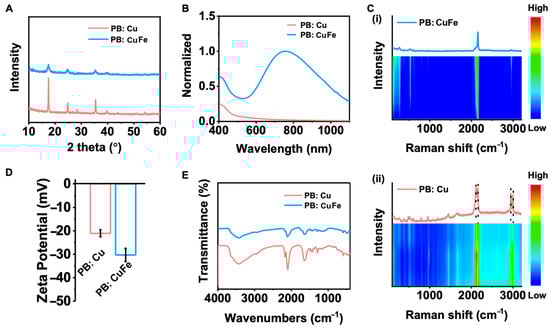 Structure characterization of PB: Cu and PB: CuFe NCs. (A) XRD patterns of the prepared PB: Cu and PB: CuFe NCs. (B) UV−vis spectra of PB: Cu and PB: CuFe NCs. (C) Time-dependent Raman spectra over a 60 min continuous exposure to a 532 nm laser (i) PB: CuFe NCs; (ii) PB: Cu NCs. (D) Zeta potentials of PB: Cu and PB: CuFe NCs. (E) FTIR spectra show that the NPs’ functional groups were successfully modified by measuring their distinctive peaks.