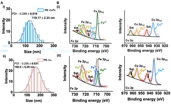 (A) The hydrodynamic size of (i) PB: Cu and (ii) PB: CuFe NCs. (B) The XPS of PB: CuFe NCs (i) and PB: Cu NCs (ii): Fe 2p, Cu 2p.