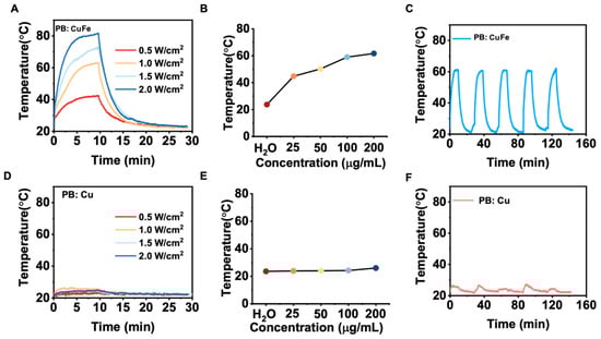 Nanomaterials with a high NIR absorption are well known to benefit considerably from the laser-induced photothermal effect. Because of their capacity to convert light into heat, PB: Cu and PB: CuFe NCs are ideal candidates as photothermal agents. In this study, PB: Cu and PB: CuFe NCs were subjected to an 808 nm laser at a power density of 0.5, 1.0, 1.5, and 2.0 W cm−2. With the increase in power, it was noticed that the highest temperature of about 82.3 °C was achieved by PB: CuFe NCs. However, PB: Cu NCs exhibited just a minor temperature rise, which is much lower than the temperature rise in PB: CuFe NCs (Figure 4A,D). After irradiating the solution with an 808 nm laser (1.0 W cm2, 10 min), different concentrations of PB: Cu and PB: CuFe NCs were injected, followed by a control injection of deionized water. When exposed to an 808 nm laser at the power of 1.0 W cm−2, the temperature of aqueous solutions containing PB: CuFe NCs can reach 44.8, 50.2, 59.0, and 61.7, corresponding to the concentrations of 25 50, 100, and 200 μg mL−1, respectively. Under identical circumstances and concentration gradient, the temperature of PB: Cu NCs only increased from 23.7 °C to 26.5 °C with the increase in concentration from 25 to 200 μg mL−1. In comparison, the temperature of deionized water was just 23.1 °C (Figure 4B,E). The photothermal stability of PB: Cu and PB: CuFe NCs was assayed using an 808 nm laser with a power density of 1.0 W cm−2 for 10 min. There was little change in the photothermal cycle stability of PB: Cu NCs in this condition. For PB: CuFe NCs, however, the temperature remained a relative constant after five repeated irradiation cycles, increasing to 60.0 °C after each cycle (Figure 4C,F).
