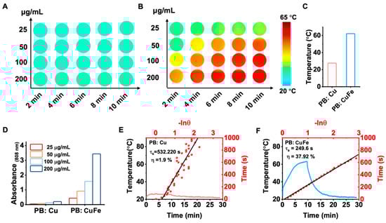 Photothermal images of the PB: Cu and PB: CuFe NCs were captured using a thermal infrared camera. The photothermal images are shown in Figure 5A,B. It can be demonstrated that the temperature increment is related to the irradiation time and the concentration of the two samples. PB: Cu and PB: CuFe NCs could reach maximum temperatures of 26.5 °C and 61.7 °C, respectively, after being exposed to an 808 nm laser (1.0 W cm−2) for 10 min (Figure 5C). PB: CuFe NCs had a greater heating temperature than PB: Cu NCs at the same mass concentration. The increase in the absorbance at 808 nm with the increasing concentrations of PB: Cu and PB: CuFe NCs indicates that the maximum temperature of the aqueous solution increases with the laser irradiation time continuously (Figure 5D). At 808 nm, the absorption value of PB: CuFe NCs is noticeably more significant than that of PB: Cu NCs. In order to analyze photothermal performance thoroughly, the photothermal conversion efficiency was calculated using Roper’s approach []. The photothermal conversion efficiency (η), calculated from the maximum steady-state temperature and the time constant (τ), presents a quantitative comparison of the light-to-heat conversion ability of PB: Cu and PB: CuFe NCs. Figure 5E,F display the cooling curves of PB: Cu and PB: CuFe NCs, and the photothermal conversion efficiency of PB: Cu and PB: CuFe NCs is 1.9% and 37.92%, respectively, calculated from this curve. Therefore, when exposed to 808 nm NIR light, PB: CuFe NCs exhibit much better NIR light absorption and heat energy production.