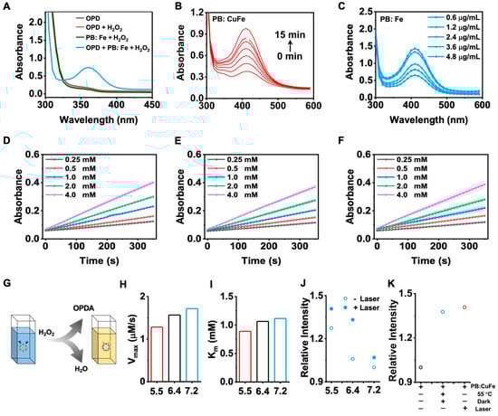 Characterizations of the OPDA catalytic activity of the PB: CuFe NCs. (A) UV–vis absorption spectra of the OPDA, OPDA + H2O2, H2O2 + PB: CuFe NC, and OPDA + H2O2 + PB: CuFe NC groups. (B) UV–vis absorption spectra of the PB: CuFe NCs during the 15 min. (C) UV–vis absorption spectra of the PB: CuFe NCs with the addition of various concentrations. Time-dependent absorbance changes at 417 nm as a result of the catalyzed oxidation of OPDA with the PB: CuFe NCs and H2O2 concentrations at pH 5.5 (D), 6.4 (E), and 7.2 (F). (G) Schematic illustration of the mechanism of the PB: CuFe NCs. The maximum reaction rate (Vmax) (H) and Michaelis–Menton constant (Km) (I) of the PB: CuFe NCs. (J) Influence of photothermal properties on catalytic performance with or without 808 nm laser irradiation for 5 min at the power intensity of 1 W cm−2. (K) Influence of photothermal properties with different groups at pH 5.5: PB: CuFe NCs, PB:CuFe NCs + 55 °C+ dark; PB:CuFe NCs + laser.
