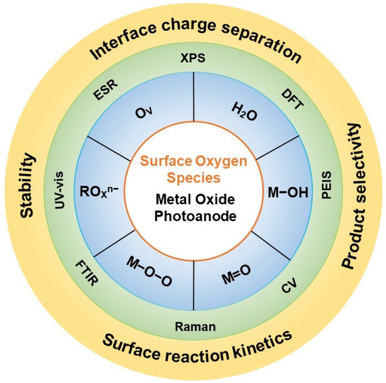 Metal oxides, such as BiVO4, TiO2, Fe2O3, and WO3, have emerged as promising materials for photoanodes due to their unique electronic structure properties, good stability, and abundance [8]. Despite these advantageous qualities, these materials suffer from drawbacks including low absorption in the visible-light range, poor charge transfer, and slow surface reactions, resulting in low solar energy conversion efficiency [9]. In recent years, various strategies have been employed to enhance the performance of metal oxide photoanodes, including morphology control [10], crystal facet engineering [11], ion doping [12,13], defect engineering [14], and core–shell structure construction [15]. However, it should be noted that most of these approaches impact the state of surface oxygen species in the photoanode, which plays a critical role in charge separation and surface reactions. Despite notable advancements in the field of surface oxygen species on photoanodes, a comprehensive literature review addressing this topic is currently lacking. Therefore, the primary objective of this article is to fill this gap by presenting a comprehensive and up-to-date overview of surface oxygen species on metal oxide photoanodes (Figure 1). Through a critical assessment of existing research, this review aims to identify the primary challenges and potential pathways for future exploration in the realm of surface oxygen species, with the ultimate goal of advancing sustainable energy production.