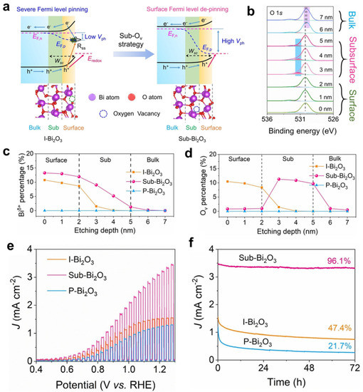 For example, Gong et al. introduced abundant oxygen vacancies on the surface of a BiVO4 photoanode, leading to a reduction in the width of the depletion layer from 9.7 nm to 6 nm [37]. This intensified the energy band bending and promoted the migration of holes to the reaction interface. Additionally, gap states introduced by oxygen vacancies can trap holes and slow down charge recombination. In the case of small-sized particle-stacked Fe2O3 photoanodes, the introduction of surface oxygen vacancies resulted in a depletion layer width of only 1 nm, providing a significant potential gradient to drive the separation of photogenerated electrons and holes [41]. Through a “self-purification” treatment driven by photoelectrochemistry, TiO2 exhibited a gradient distribution of oxygen vacancies in the surface layer, within a thickness range of approximately 9.5 nm, achieving a charge transport efficiency of 95% [42]. Theoretical calculations conducted by Wang et al. have revealed the significant impact of subsurface oxygen vacancies (sub–Ov) on the behavior of oxide semiconductors, particularly in terms of Fermi level de-pinning and enhanced hole migration (Figure 4a) [43]. To verify this, the author developed a series of oxide photoanodes that exclusively possess subsurface holes (Figure 4b–d). In comparison to oxides with surface oxygen vacancies or those lacking oxygen vacancies entirely, the presence of sub–Ov in the oxide photoanodes demonstrated superior activity and stability (Figure 4e, f). The active sub–Ov structure effectively lowers the energy barrier of the rate-determining step during the water oxidation process, thereby enhancing the kinetics of water oxidation.