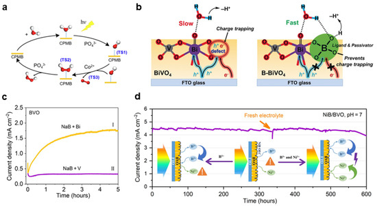 In addition to the oxygenated intermediates involved in water oxidation in the photoanode, the oxyanion species in the electrolyte also play a key role in the photoanode reactions. Oxyanion species on the surface of metal oxides can promote charge separation and surface reactions through post treatment. For example, phosphate treatment on the surface of BiVO4 can improve the Faradaic efficiency of water oxidation to H2O2, achieving a long-lasting PEC reaction of more than 100 h [95] (Figure 9a). Studies have also shown that phosphate not only promotes the splitting of water molecules into adsorbed hydroxyl groups, but also facilitates the desorption of hydrogen peroxide [95]. Peroxycarbonate, produced by the oxidation of the carbonate, can easily decompose to produce hydrogen peroxide. Thus, it is often used as an electrolyte in the research of hydrogen peroxide produced by PEC [96]. The addition of carbonate can also generate carbonate radicals, accelerating organic matter degradation and generating more active oxygen species for selective oxidation [97]. When Br− ions are introduced into the electrolyte, the BrO− produced by it can also be used for an epoxidation reaction with excellent selectivity [84]. However, the presence of anions is not always advantageous, as anion oxidation may occur instead of water oxidation. For instance, the Faradaic efficiency of tungsten oxide photoanodes for oxygen evolution reaction in acidic sodium sulfate electrolytes is relatively low because most of the holes are utilized for sulfate ion oxidation [98]. In addition, oxyanions also influence charge separation at the semiconductor–electrolyte interface. Immersing a BiVO4 photoanode in borate modifies the catalytic local environment and reduces surface charge recombination, resulting in faster water reactions [99] (Figure 9b). The dissolution of semiconductors produces the corresponding oxyanions, and the regulation of the dissolution process is crucial to the stability of the semiconductor–electrolyte reaction interface. For example, bismuth vanadate undergoes continuous leaching of vanadate ions during the reaction process, limiting its long-term stability. By adjusting the composition of the electrolyte, vanadate ions leaching in bismuth vanadate can be suppressed in the vanadate-saturated electrolyte, significantly improving stability [100]. Further studies demonstrated that boron species in the electrolyte could replace vanadate ions after the leaching of vanadate ions in borate solution, resulting in enhanced activity [101] (Figure 9c). By introducing nickel species into the electrolyte, a dynamically stable nickel borate coating layer can be formed on the surface of the bismuth vanadate, resulting in an excellent stability of the prepared photoanode (Figure 9d).